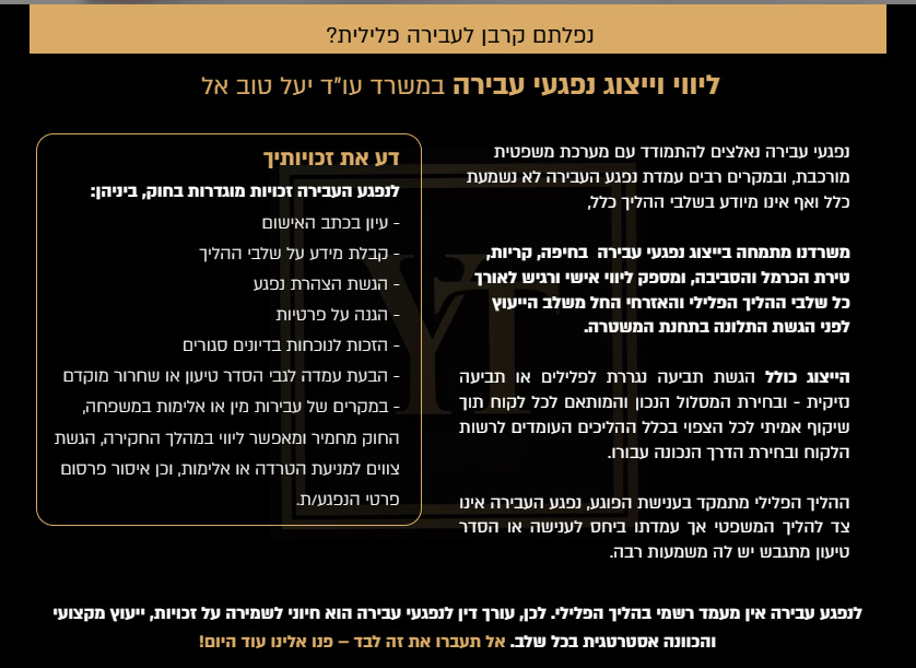 המשרד עוסק במתן מגוון שירותים משפטיים בתחומי המשפט הפלילי על כל רבדיו ומעניק ייצוג פלילי בחיפה, קריות, טירת הכרמל והסביבה